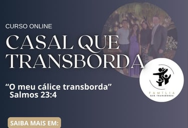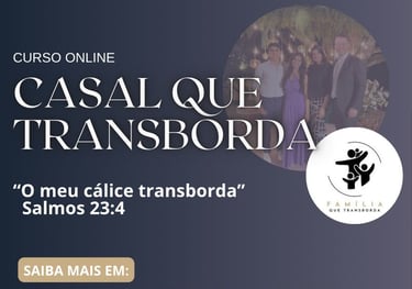 O curso on line Casal que Transborda foi desenvolvido para casais que desejam fortalecer seu relacionamento à luz dos princípios bíblicos, construindo uma união sólida, saudável e cheia de propósito. Através de ensinamentos práticos, reflexões profundas e dinâmicas interativas, este curso ajudará você e seu cônjuge a desenvolver uma comunicação eficaz, aprofundar a intimidade e alinhar seus valores à vontade de Deus para o casamento.